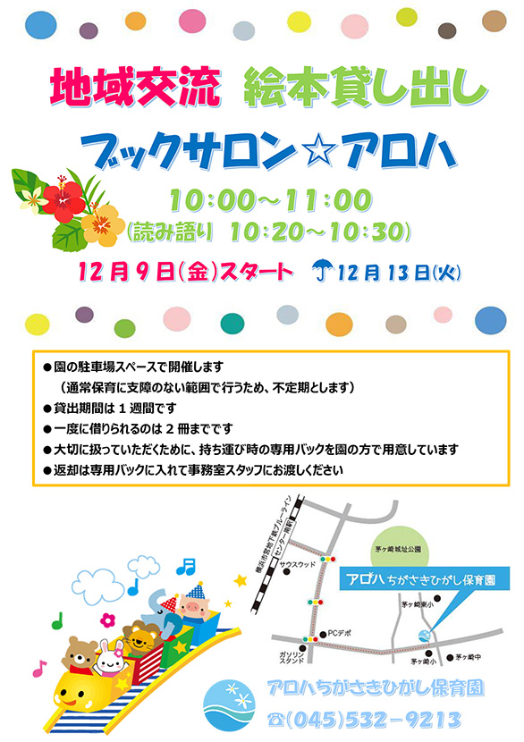 ちがさきひがし保育園にて、絵本の貸出「ブックサロン☆アロハ」を開催します!